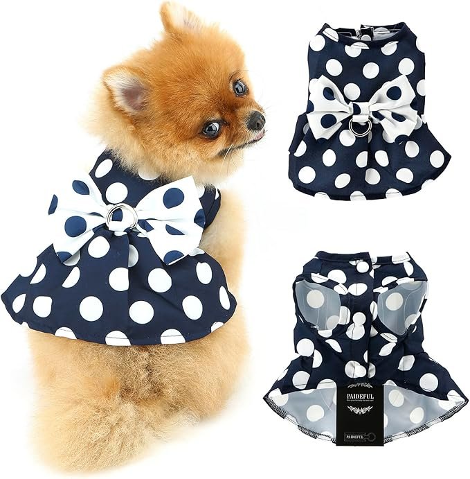 Dog Harness Dress,Retro Bow Princess Dresses for Small Dogs Cats Fashion Polka Dot Puppy Pleated Skirt Soft Lightweight Doggy Sundress Button up Chihuahua Clothes Costume D-Ring,Blue